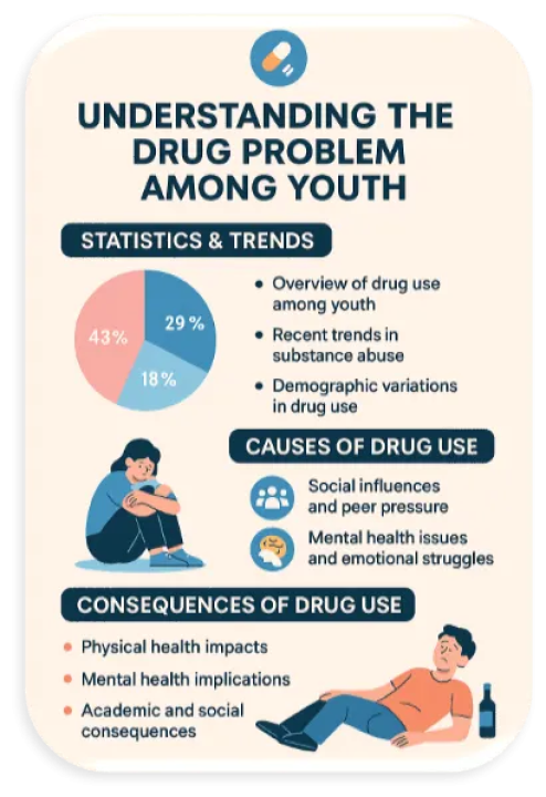 Research shows that the late teens and early twenties are a vulnerable period for first-time drug use, often influenced by stress, curiosity, or peer pressure. Educational institutions are ideal platforms to intercept this risk by: