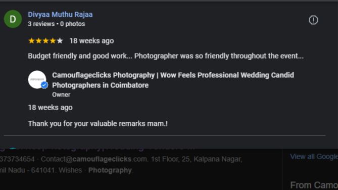 Approached Camouflage clicks for their photography services for a family event.Very Well informative of their services and products(Mr.Yasar).Effective communication and follow up by their customer executive(Mr.Santhanakumar).Arrived on time and professional…